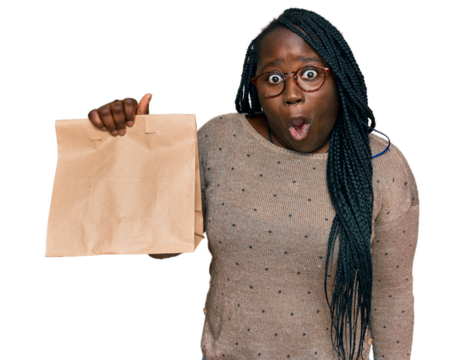 Young black woman with braids holding take away paper bag scared and amazed with open mouth for surprise, disbelief face