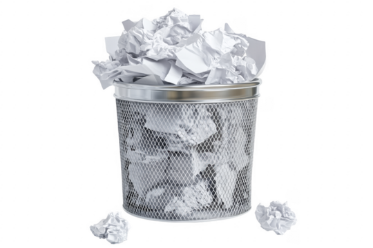 Full trash can overflowing with crumpled paper balls isolated PNG with Transparent Background