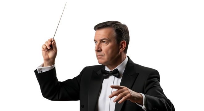 Maestro's Guidance: A focused conductor elegantly directs an orchestra, his baton guiding the harmonious creation of music. Capturing the poise and passion of classical musical performance.