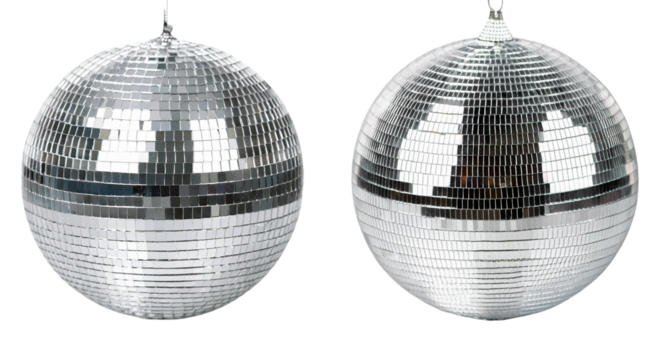 Two stylish disco balls hanging, reflecting light, perfect for parties and entertainment settings.