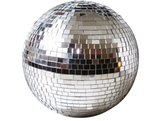 A fashionable woman wearing a silver outfit poses putting a vintage disco ball on her head, set against a transparent background.