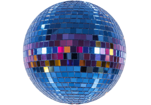 Shiny disco mirror ball with reflective tiles isolated on transparent background