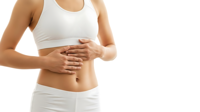 Transparent background closeup of hand on stomach indicating pain or discomfort