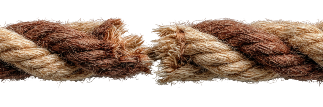 Worn rope fibers separating, depicting fragile connection, emotional strain, and impending disconnection