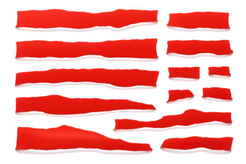 Red ripped paper pieces with jagged edges and adhesive tape, offering versatile design elements on a transparent background