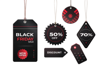 A red sale price tag featuring minus 50 percent text with a stitched border effect and small hanging loop, subtle depth and realistic fabric like texture for a retail discount label, isolated on trans