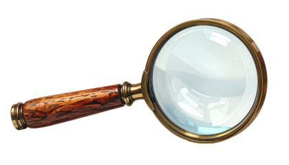 Detailed image of a vintage brass magnifying glass with a decorative handle, clear lens
