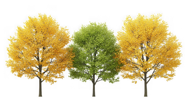 Three distinct green trees of varying sizes and shapes isolated on transparent background