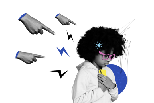 Creative picture collage young victim girl suffer psychological pressure fingers pointing cyber bullying hatred shaming social media