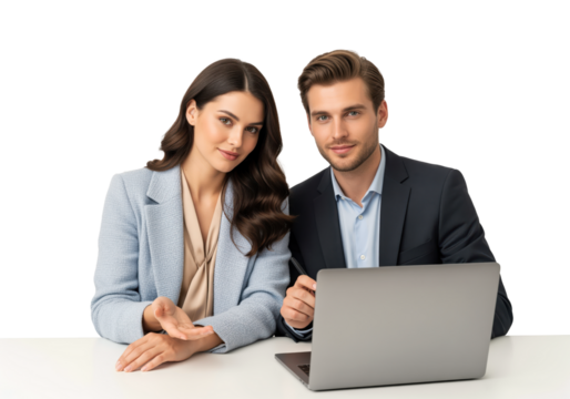 A professional man and woman in business attire collaborate intently while reviewing information on a laptop screen isolated on transparent background