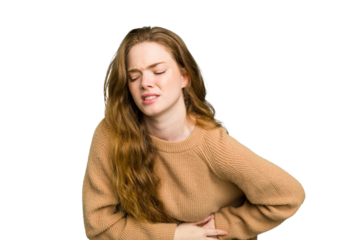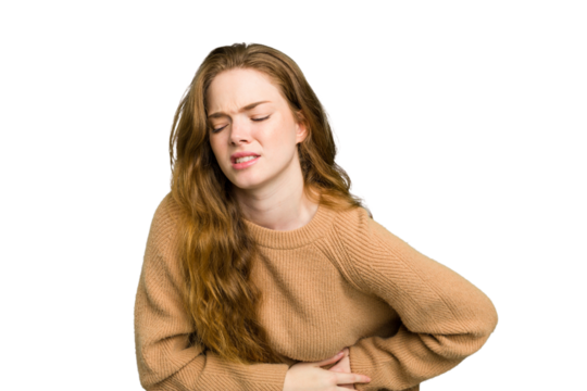 Young caucasian redhead woman isolated having a liver pain, stomach ache.