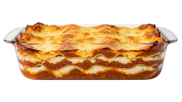 Square serving of cheesy layered pasta dish on white plate, garnished with basil and tomatoes