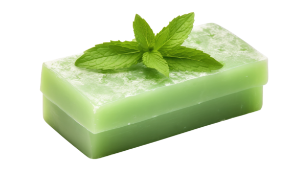 Natural soap bar with visible herbs placed in a white speckled ceramic dish. Perfect for bathrooms or kitchens, combining functionality and rustic elegance. Isolated on transparent background, png.