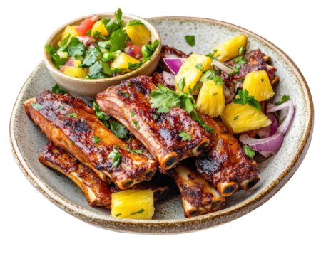 Delicious Caribbean jerk ribs served with pineapple and fresh salsa, garnished with cilantro. vibrant and flavorful dish perfect for any occasion