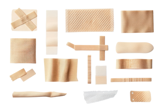 Assorted adhesive bandages in various shapes and sizes on a white background, ideal for first aid and medical illustrations.