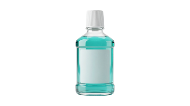 Realistic 3d rendering of clear plastic bottle filled with bright blue oral rinse on transparent background