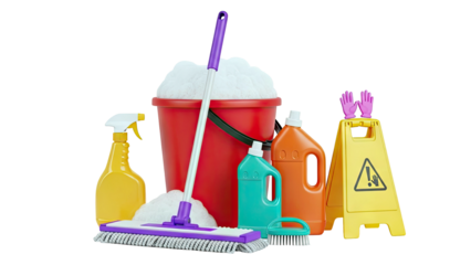 Cleaning Supplies with Mop, Bucket, and Wet Floor Sign