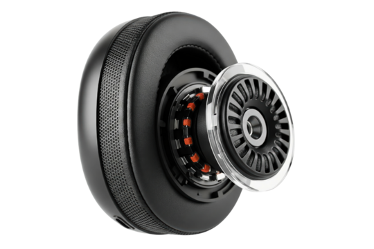 Deconstructed headphone ear cup showing internal parts isolated with transparent background