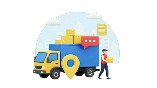 Delivery Truck with Checklist, Chat Bubble, and Location Pin