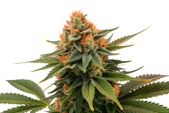 Closeup of a mature cannabis plant flower showcasing vibrant orange pistils and green leaves, a marijuana bud isolated on a white background for medicinal concept