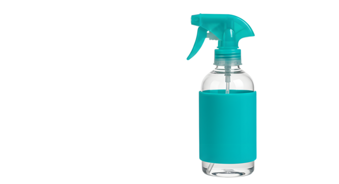 A clear spray bottle with a turquoise trigger and label, set against a plain background, ideal for cleaning product displays