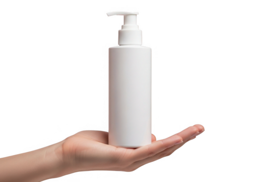 Hand holding a white pump bottle dispenser for liquid soap or lotion isolated on transparent background
