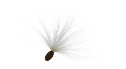 Dandelion seed head dispersing pappus seeds by wind, symbolizing wish, ephemeral nature, and freedom on transparent background