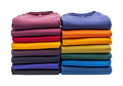 Retail store's colorful stacked t-shirt showcase isolated on transparent background, png