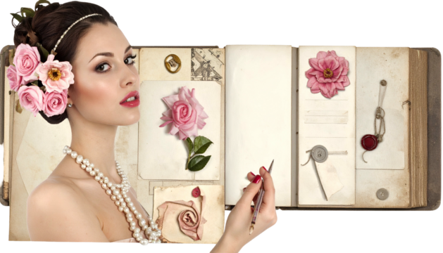 Woman with floral hair, pearl necklace, and album with vintage floral displays