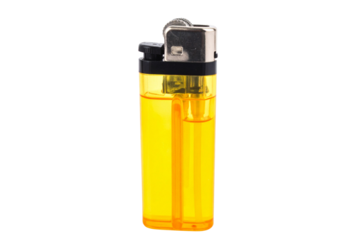 Close up shot of a yellow transparent disposable lighter against a PNG background, lighter, disposable, yellow, transparent, fuel, fluid, gas, cigarette, smoking, fire, flame, ignition, object, isolat
