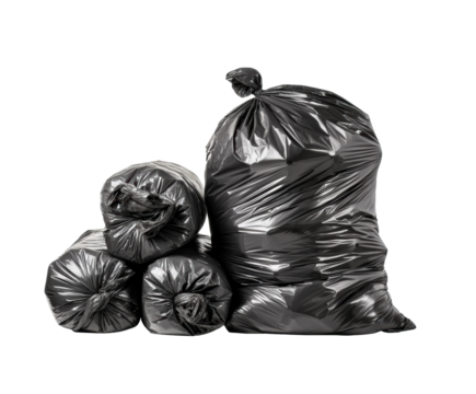 Collection of black trash bags for waste disposal and recycling, cut out transparent