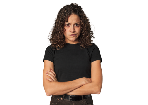 Person frowning with arms crossed isolated on transparent background