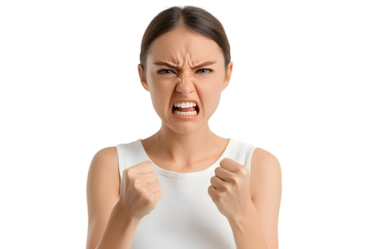 Frowning woman expressing frustration on transparent background