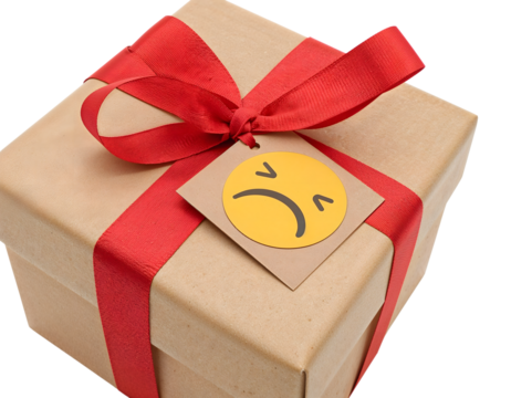 Brown gift box with red ribbon and sad emoji tag isolated on the transparent background, concept of unwanted or disappointing present
