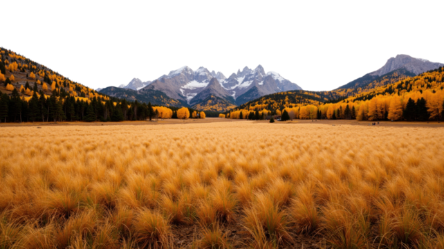 Lush green meadow filled with wildflowers and distant mountain peaks isolated on transparent background