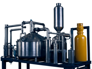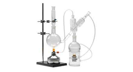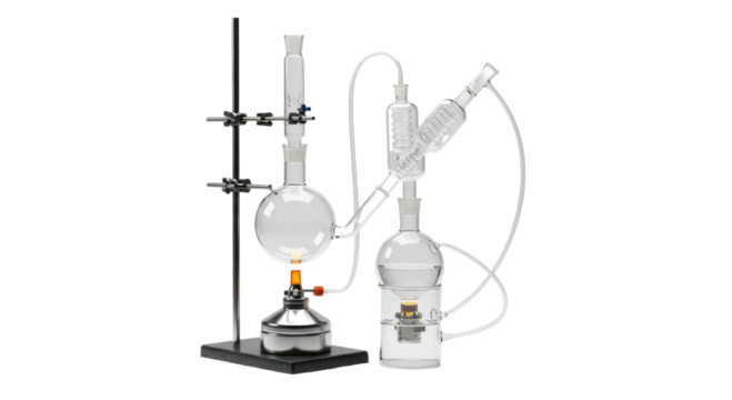 Scientific laboratory distillation apparatus with glass flasks and condenser isolated on transparent background