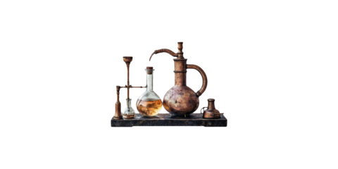 Antique chemistry apparatus with glassware and copper distiller isolated on transparent background