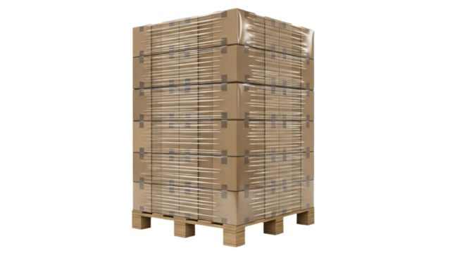 A stack of cardboard boxes on wooden pallets, ready for distribution transparent background