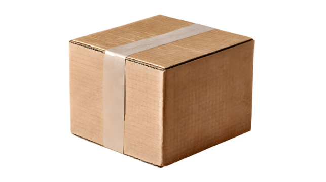 A plain brown corrugated cardboard shipping box with clear packing tape on a white background