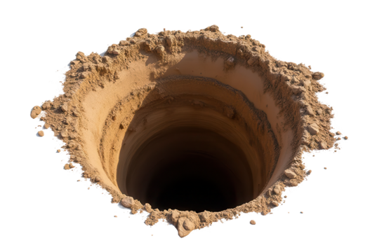 Deep Circular Hole in Ground Surrounded by Sand and Dusty Soil