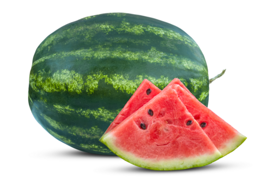 Several triangular slices of ripe watermelon in front of a large watermelon. Isolation on a transparent background.