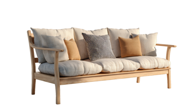 Modern minimalist wooden sofa with beige cushions on white background