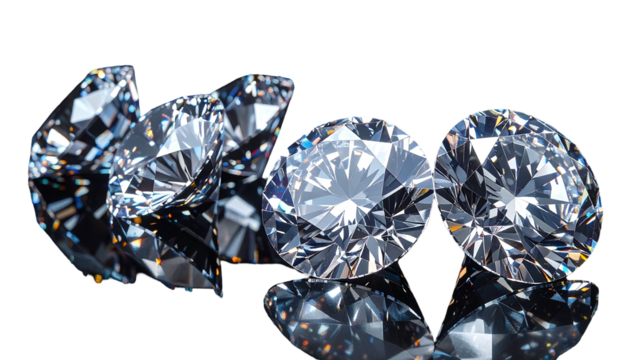 Close-up of several sparkling, brilliant-cut gemstones, reflecting light. The gems vary in size, set against a dark, glossy background