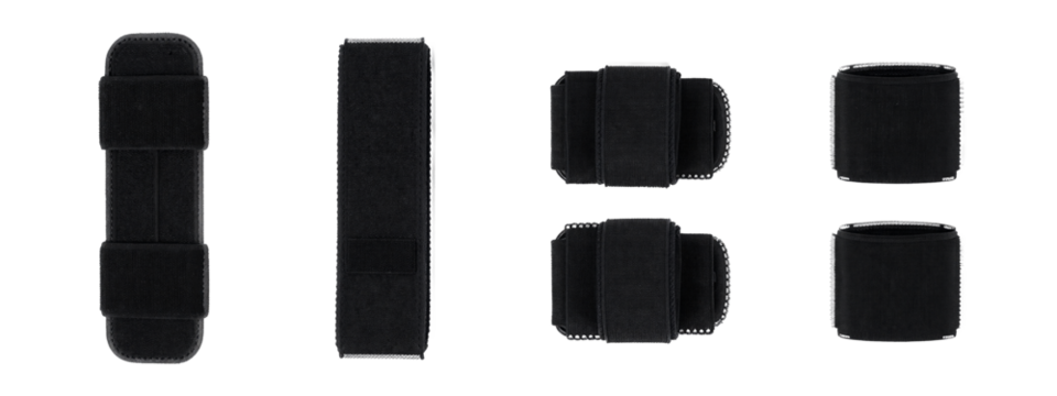 Photograph of five black, rectangular, textured foam pieces arranged horizontally. Pieces vary in size and have rounded edges.
