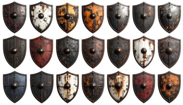Collection of weathered medieval shields, diverse colors & rust, arranged in rows