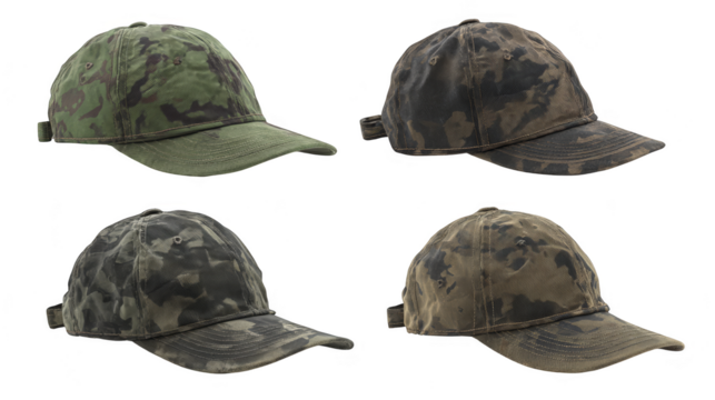 Four camouflage hats, a showcase of diverse patterns and styles for outdoor enthusiasts.