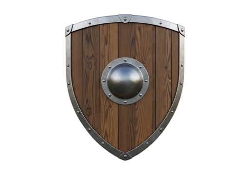 Medieval wooden kite shield with metal rim and boss isolated on a transparent background