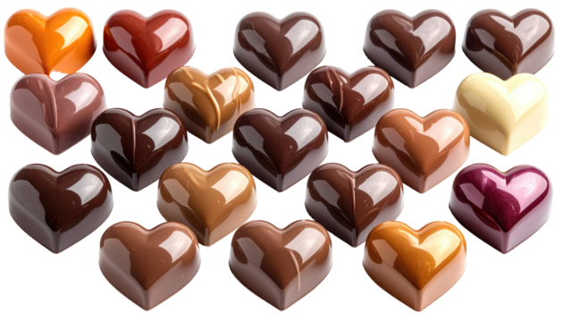 A close-up arrangement showcases heart-shaped confectionary treats in diverse shades, from amber to deep brown, with glossy surfaces