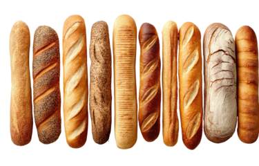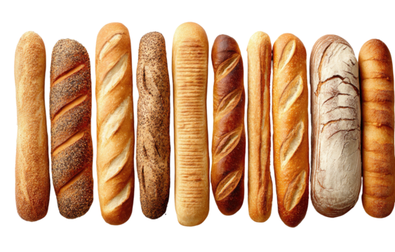 A horizontal array of diverse artisan bread loaves