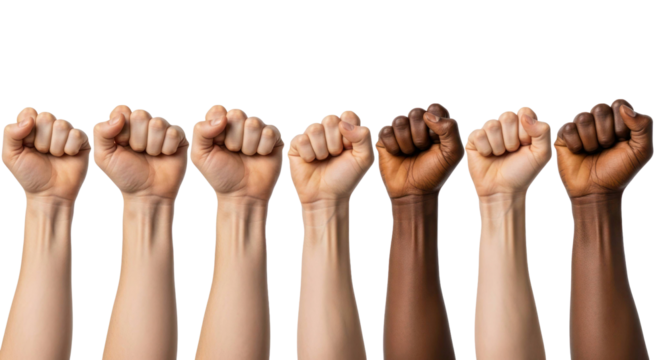 Diverse raised fists in solidarity showcasing various skin tones representing unity and strength in social movements. Isolated on transparent background